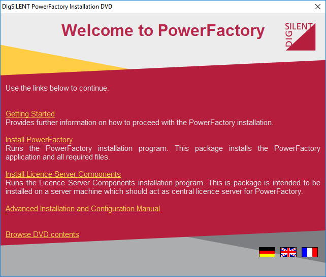 Neste menu, a instalação dos componentes principais do PowerFactory pode ser iniciada.