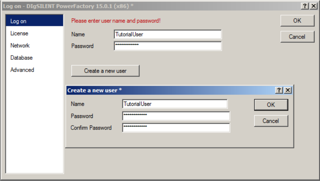 Ao iniciar o PowerFactory deve se inserir o nome de usuário e a senha na janela de diálogo "Log on".