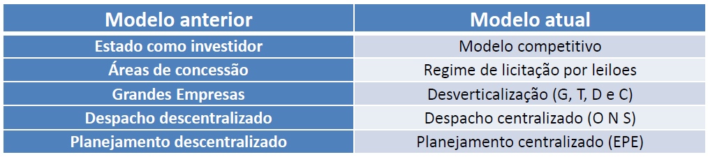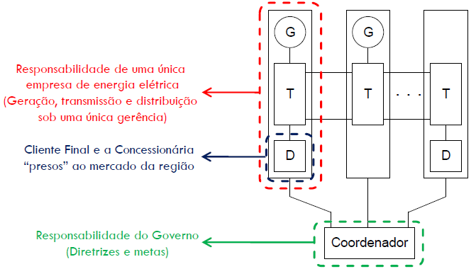 Concessão de fornecimento de energia elétrica para uma determinada região: O modelo era fortemente regulado e não existia possibilidade de uma empresa comercializar energia diretamente com os consumidores fora da sua área de concessão.
