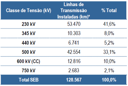 Transmissão: 230 kV, 345 kV, 500 kV, 765 kV, 1000 kV e 1200 kV