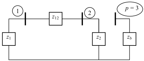 Realizando um ensaio no qual se injeta uma corrente unitária na barra 1, tem-se que a tensão na barra $\small p = 3$, devido a esta corrente, é nula; o mesmo aconteceria se fosse injetada uma corrente unitária na barra 2. Por outro lado, quando a corrente unitária é injetada na barra $\small p = 3$, aparece uma tensão na barra $\small p = 3$ com valor igual a $\small z_b.$