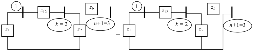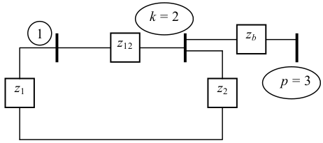 Injetando-se uma corrente unitária na barra 1, a tensão na barra $\small p = 3$ é a mesma que a tensão da barra $\small k = 2$. Injetando-se uma corrente unitária na barra $\small k = 2$, a tensão na barra $\small p = 3$ também é a mesma que a tensão da barra $\small k = 2$. Injetando-se uma corrente unitária na barra $\small p = 3$, a tensão será a impedância vista da barra $\small k = 2$ adicionada de $\small z_b$.