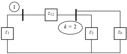 $\small \left[ {\begin{array}{*{20}{c}} V_{1} \\ V_{2} \\ 0 \end{array}} \right] = \left[ {\begin{array}{*{20}{c}} Z_{11} & Z_{12} & Z_{11} - Z_{21} \\ Z_{21} & Z_{22} & Z_{21} - Z_{22} \\ Z_{11} - Z_{21} & Z_{12} - Z_{22} & Z_{11} + Z_{22} - Z_{12} - Z_{21} + z_b \end{array}} \right] \left[ {\begin{array}{*{20}{c}} I_{1} \\ I_{2} \\ I_{3} \end{array}} \right]$