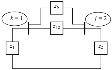 Seja o sistema original composto de duas barras. Na figura a seguir, mostra-se este sistema acrescido de uma nova impedância $\small z_b$.