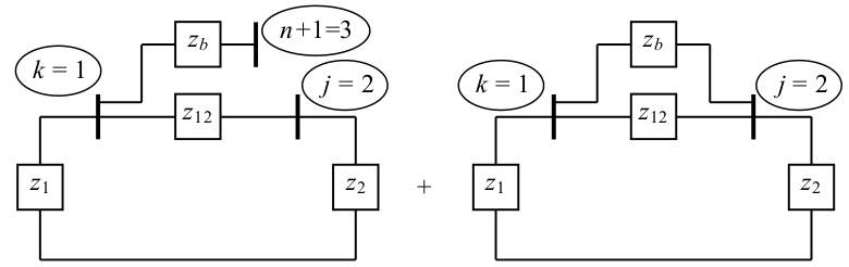 Regra 4: Inclui-se, temporariamente, nova linha e nova coluna na matriz $\small {Z_{\rm{ORIGINAL}}}$, onde os elementos fora da diagonal principal são iguais à diferença entre os elementos das colunas/linhas $\small k$ e $\small j$ e o elemento da diagonal principal $\small Z_{kk} + Z_{jj} − Z_{kj} − Z_{jk} + z_b$. Elimina-se a linha e a coluna da barra fictícia aplicando a redução de Kron.