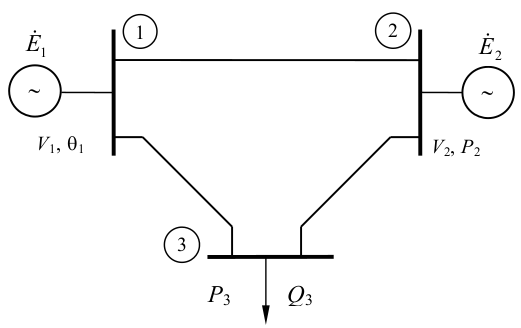 $\scriptsize \begin{array}{*{20}{c}} \begin{array}{l} {P_2} = \left| {{V_2}} \right|\left[ {{V_1}\left\{ {{G_{21}}\cos \left( {{\theta _{21}}} \right) + {B_{21}}sen\left( {{\theta _{21}}} \right)} \right\} + } \right.\\ \begin{array}{*{20}{c}} {}&{\left. {{V_2}\left\{ {{G_{22}}\cos \left( {{\theta _{22}}} \right) + {B_{22}}sen\left( {{\theta _{22}}} \right)} \right\} + {V_3}\left\{ {{G_{23}}\cos \left( {{\theta _{23}}} \right) + {B_{23}}sen\left( {{\theta _{23}}} \right)} \right\}} \right]} \end{array} \end{array}\\ \begin{array}{l} {P_3} = \left| {{V_3}} \right|\left[ {{V_3}\left\{ {{G_{31}}\cos \left( {{\theta _{31}}} \right) + {B_{31}}sen\left( {{\theta _{31}}} \right)} \right\} + } \right.\\ \begin{array}{*{20}{c}} {}&{\left. {{V_2}\left\{ {{G_{32}}\cos \left( {{\theta _{32}}} \right) + {B_{32}}sen\left( {{\theta _{32}}} \right)} \right\} + {V_3}\left\{ {{G_{33}}\cos \left( {{\theta _{33}}} \right) + {B_{33}}sen\left( {{\theta _{33}}} \right)} \right\}} \right]} \end{array} \end{array} \\ \begin{array}{l} {Q_3} = \left| {{V_3}} \right|\left[ {{V_3}\left\{ {{G_{31}}sen\left( {{\theta _{31}}} \right) - {B_{31}}\cos \left( {{\theta _{31}}} \right)} \right\} + } \right.\\ \begin{array}{*{20}{c}} {}&{\left. {{V_2}\left\{ {{G_{32}}sen\left( {{\theta _{32}}} \right) - {B_{32}}\cos \left( {{\theta _{32}}} \right)} \right\} + {V_3}\left\{ {{G_{33}}sen\left( {{\theta _{33}}} \right) - {B_{33}}\cos \left( {{\theta _{33}}} \right)} \right\}} \right]} \end{array} \end{array} \end{array} $